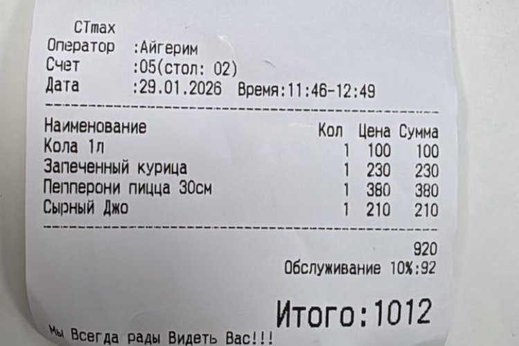 По его словам, в чеке кафе «Гурман бургер», расположенного на улице Мамбета Токсонбаева, в общей сумме указано дополнительное начисление за обслуживание.