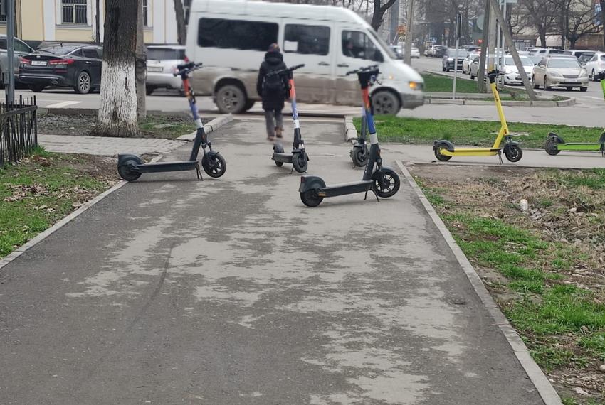Жители Бишкека с наступлением теплой погоды все чаще жалуются на разбросанные на тротуарах электросамокаты.