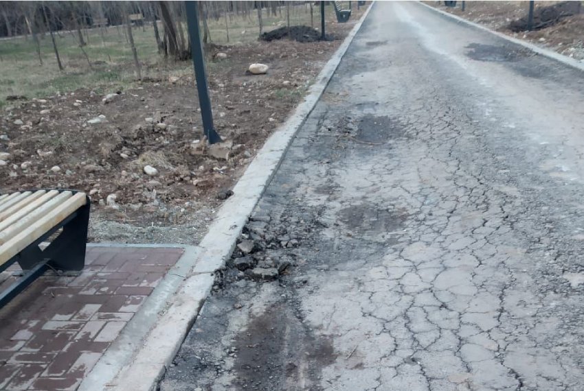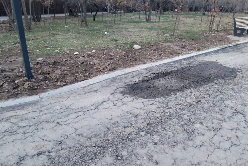 Жители Бишкека сообщили 24.kg о повреждениях тротуара в верхней части парка имени Ататюрка. По их словам, недавно уложенный асфальт на пешеходной дорожке уже начал трескаться, а в некоторых местах появились ямы.