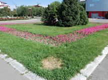 В разгар лета, когда, по идее, все должно цвести и благоухать, клумбы на площади выглядят жалко. Многие цветы так и не укоренились, часть рассады засохла, местами все заросло травой.