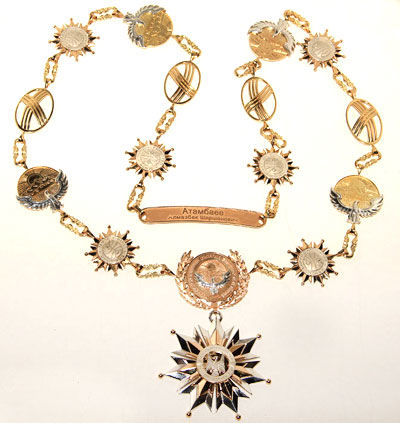 Нагрудный знак президента состоит из трех основных частей: знака отличия, герба в обрамлении венка из лавровых ветвей и золотой цепи.