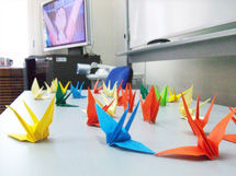 Рядом идет не менее кропотливая работа - изготовление всем известных журавликов. Слишком маленький листок цветной бумаги не всегда поддается неумелым рукам, уголки упрямо не хотят быть похожими на оригинал.