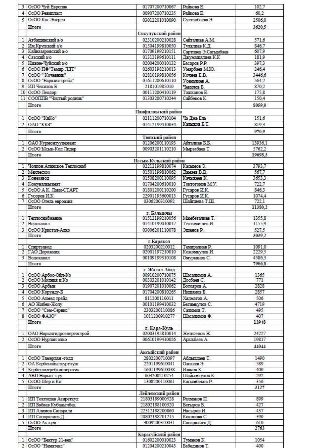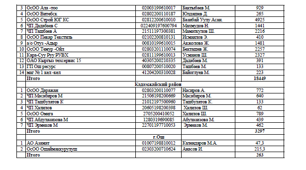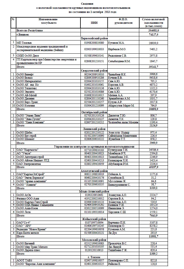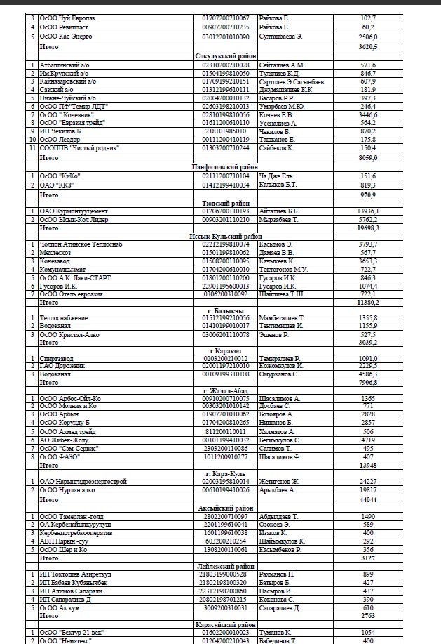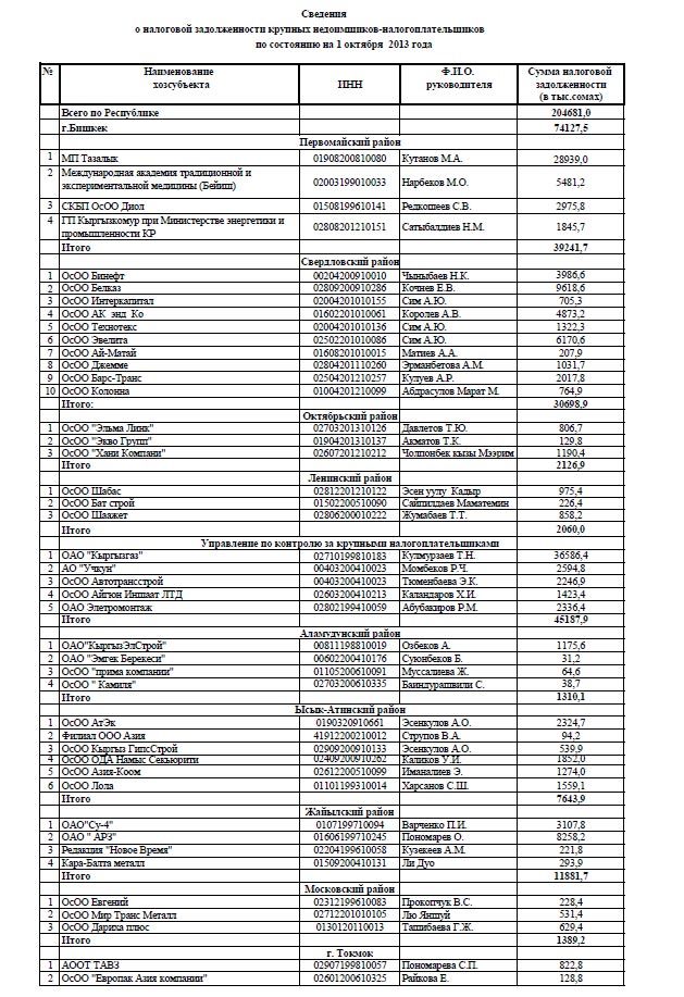 В Свердловском районе недоимка составила почти 3,7 миллиона сомов. Октябрьский район недобрал 2,12 миллиона, Ленинский - 2,07 миллиона сомов.