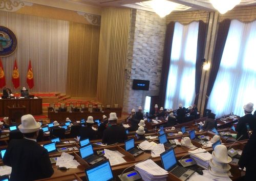 На мужчин-депутатов парламента Кыргызстана надели калпаки. Сегодня их коллеги-женщины подарили мужчинам национальные головные уборы. Все мужчины во главе со спикером сидят на заседании в калпаках.