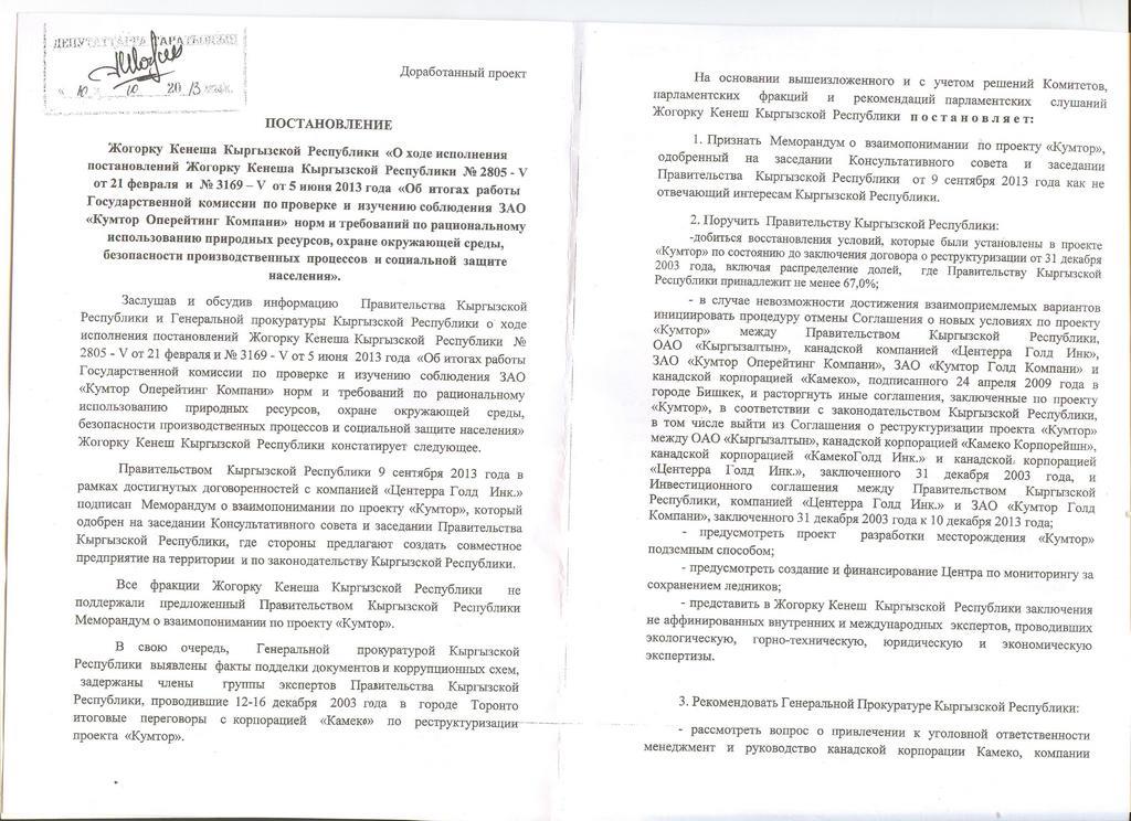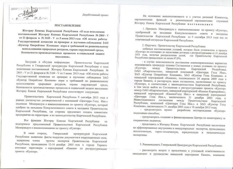 В нем говорится: если правительство до 10 декабря не сможет договориться с канадцами об увеличении доли в совместном предприятии по разработке золоторудного месторождения Кумтор, Кыргызстан должен денонсировать соглашение 2009 года в одностороннем порядке. На сегодня правительство заключило с канадским инвестором меморандум о создании СП с равным долевым участием. Пока парламент отказывается поддерживать документ.