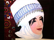По правде говоря, я шла на выставку и думала, что, пожалуй, невозможно удивить кыргызстанца, живущего у себя на родине, тем, что он и так видит практически каждый день. Однако работы неожиданно убедили в обратном: их интересно рассматривать. Радуют взор яркие, сочные краски, вызывает улыбку несколько наивное представление - так могут рисовать кыргызских женщин только иностранцы или те, кто давно живет за границей и редко бывает в КР. Впрочем, и живописными портретами назвать эти работы сложно - к живописи они имеют отношение лишь потому, что выполнены на холсте. Пожалуй, главное в этих полотнах - так называемая смешанная техника: Тажигуль Кунтуз щедро украсила свои работы аппликациями из бус, цветных камешек, металлических украшений, капроновых лент, тесьмой, искусственными косичками, фрагментами из туш-кийизов, а в некоторых картинах в качестве фона дорисовала орнамент из кыргызского шырдака. «Просто живописно представить кыргызов мне показалось недостаточным, поэтому я использовала различные декоративные элементы», - сказала художница, словно прочитав мои мысли.