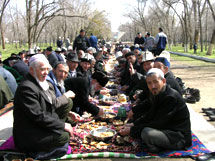 Гости смогли воочию наблюдать строгую иерархию сельской жизни: вначале за импровизированный лоскутный «стол» на траве, застеленный принесенными из каждого дома отрезами тканей всевозможных расцветок, посадили аксакалов, затем приглашенных гостей, и только потом - остальных. Неизменная черта любого традиционного праздника - проявление уважения к старшим.