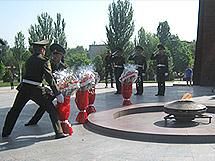 После более чем получасовой задержки, когда и учащиеся, и мэр уже порядком притомились на солнышке, началось возложение цветов к Вечному огню.