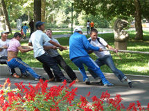 Внимание зрителей привлекают настоящие батыры, перетягивающие канат. Три попытки, и победитель определен. Самой сильной оказалась команда Первомайского района, она оставила позади Октябрьский и Свердловский районы.