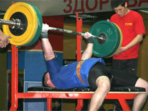 В это время на помост поднялся очередной участник Александр Кузнецов. Намазав руки тальком, он присел на скамью и обеими ладонями с силой ударил себя по щекам. Через несколько секунд из динамиков раздалось: «Вес взят».