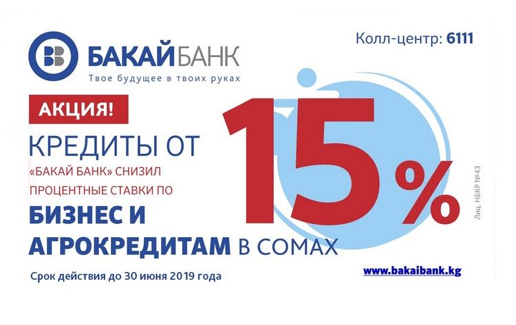 «Бакай Банк» продолжает выгодную акцию по снижению процентных ставок на бизнес- и агрокредиты в национальной валюте на 3 процента для юридических, физических лиц и индивидуальных предпринимателей.