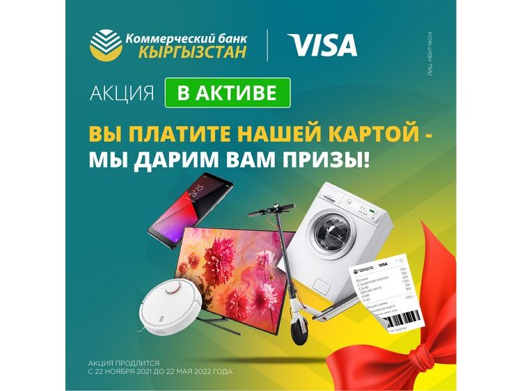 Оплачивайте картой VISA «Коммерческого банка КЫРГЫЗСТАН» в магазинах, точках питания, на АЗС, совершайте онлайн-покупки и получите шанс выиграть десятки призов, а также выиграть СУПЕРПРИЗ — 55 тысяч сомов.