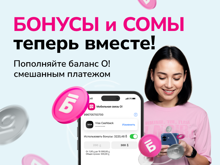 Пользователи «Мой О!» могут оплатить услуги связи и сомами с карты, кошелька или счета, и накопленными бонусами. Проверить их количество можно в приложении «Мой О!».