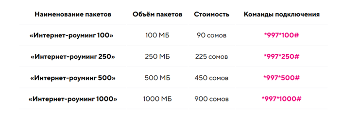 Стоимость указана с учетом всех налогов. Подробную информацию обо всех услугах в роуминге можно найти на сайте o.kg.