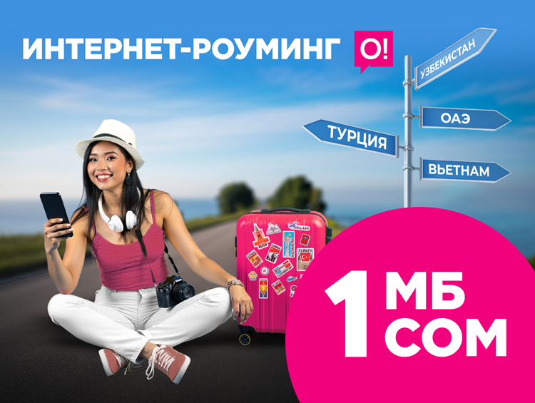 Впереди у кыргызстанцев долгожданные майские выходные. И это отличная возможность отправиться в путешествие, увидеть новые места или просто сменить обстановку. А чтобы не терять связь с близкими и не оставаться без интернета в поездке, подключите «Интернет-роуминг» от О! по тарифу всего 1 сом за 1 мегабайт. Это удобно и выгодно — не надо вынимать и вставлять симки.