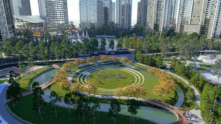 Из общей площади в 53,5 гектара под зеленые зоны, ландшафт и общественные пространства запланировано 27,3 гектара, или 51 процент территории. Помимо озера и центрального парка, яркие сады в восточном и европейском стиле распределены по периметру комплекса, создавая плавные переходы между жилыми башнями, торговыми центрами и офисными зданиями.