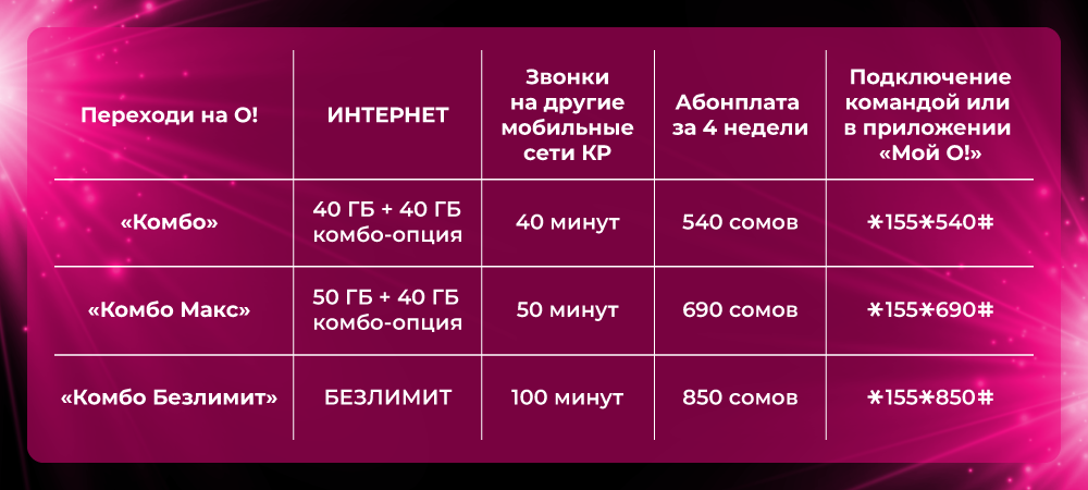 Подробнее о тарифах линейки «КОМБО» можно узнать на сайте: o.kg.