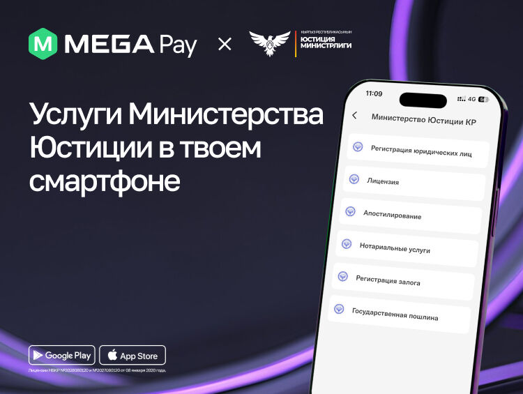 Мобильное приложение MegaPay от государственного оператора сотовой связи MEGA предоставляет гражданам Кыргызстана быстрый, удобный и безопасный способ оплаты широкого спектра услуг Министерства юстиции, где бы вы ни находились.