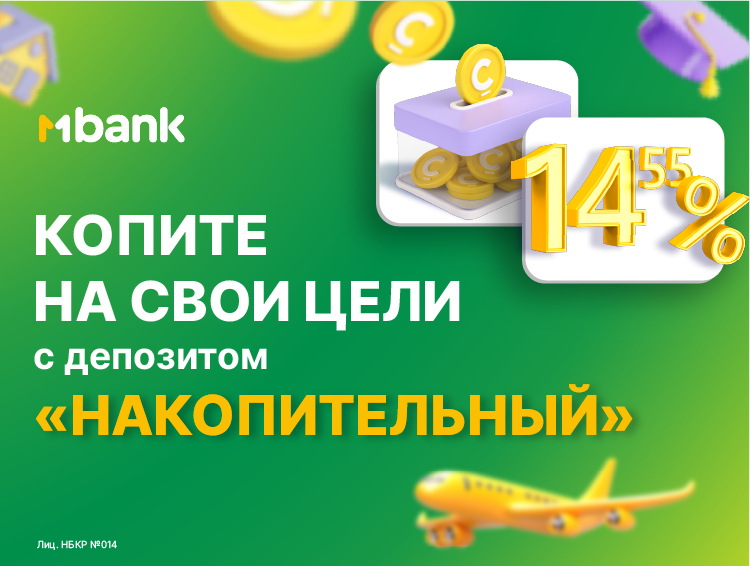 Накопительный депозит от MBANK — это надежный способ приблизиться к своим целям. Высокая ставка 14,55 процента годовых в сомах, свободное пополнение и финансовая дисциплина: вы откладываете — и точно не тратите.