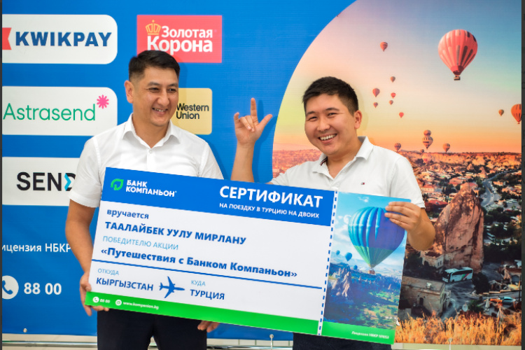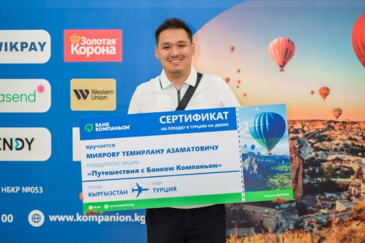 «Банк Компаньон» провел церемонию награждения победителей акции «Путешествуй с «Банком Компаньон». В результате 18 клиентов из разных уголков Кыргызстана получили главный приз — путевки в Турцию на двоих.