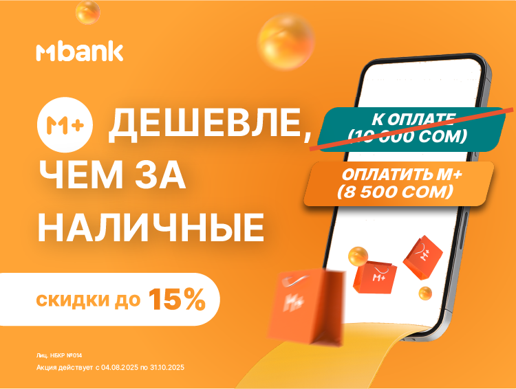 Например, если товар стоит 1 тысячу сомов, при оплате через M+ вы увидите «Оплатить М+ 850 сомов». Наглядная разница привлекает внимание.