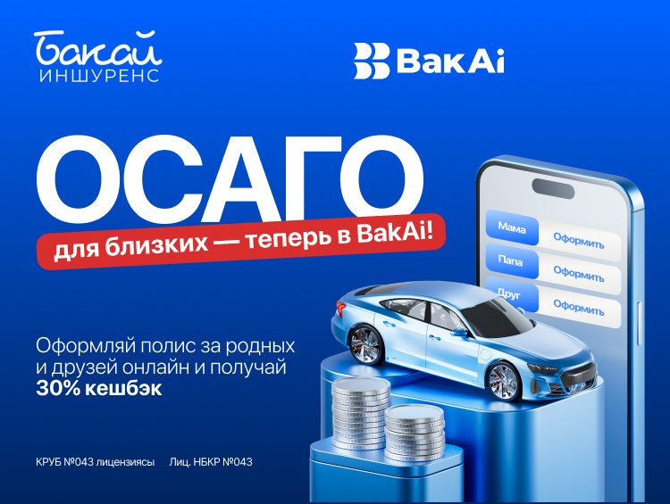 Теперь пользователи мобильного банка BakAi могут оформить полис ОСАГО не только на собственное авто, но и на транспортные средства, зарегистрированные на родственников, друзей или знакомых. Новая опция делает страхование еще удобнее, а клиенты получают 30 процентов кешбэка реальными деньгами за покупку ОСАГО через BakAi.