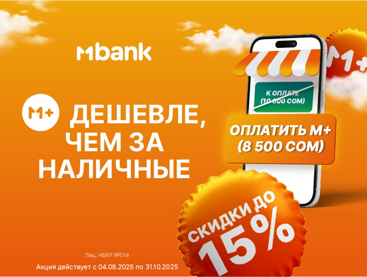 Таким образом, с М+ вы экономите вдвойне: рассрочка без переплат делает оплату удобной, а скидки еще выгоднее, чем покупка за наличные: например, если товар стоит 1 тысячу сомов, при оплате через M+ вы увидите «Оплатить М+ 850 сомов».
