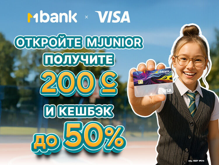 Откройте ребенку его первую карту MJunior от MBANK, и он получит бонусы: 200 сомов на карту и кешбэк до 50 процентов на покупки!