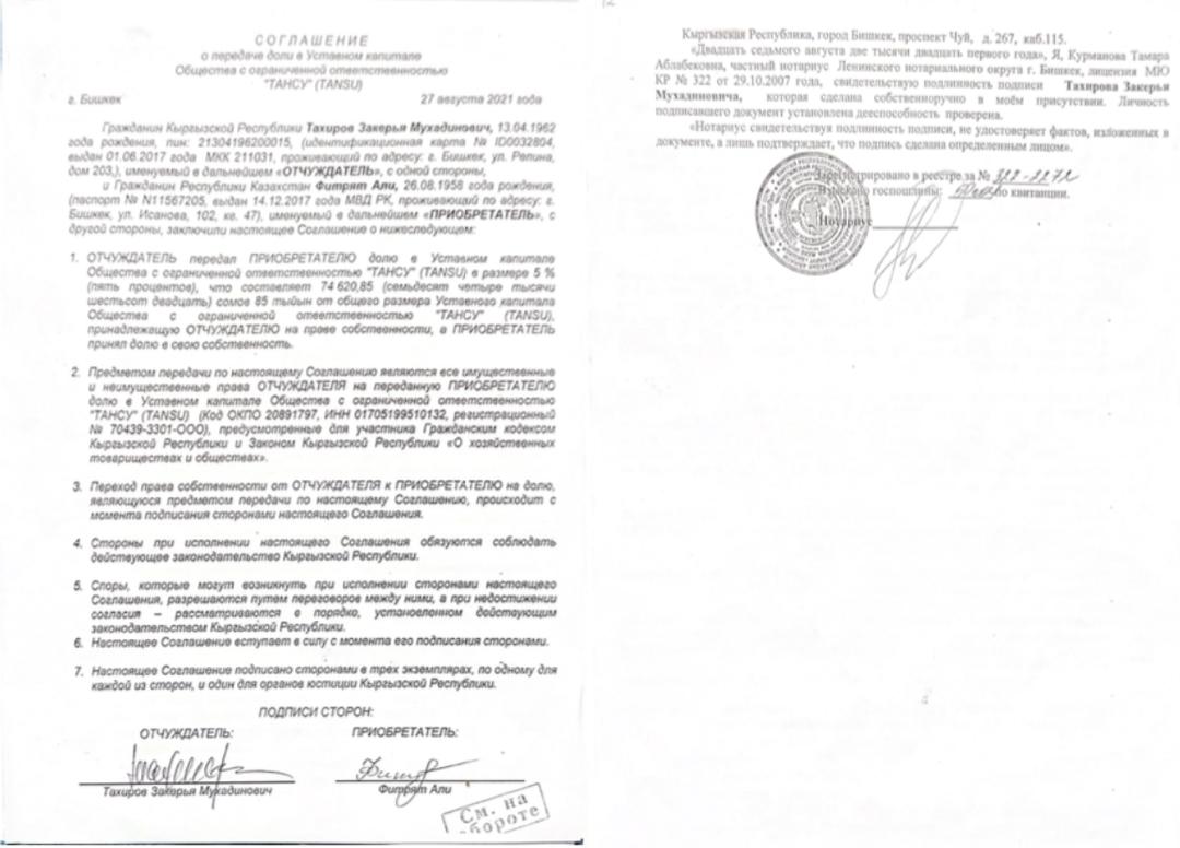 Что касается претензий Тахирова к Министерству юстиции об отказе в перерегистрации, то следует отметить, что в настоящее время продолжаются судебные процессы, инициированные нами с целью оспаривания его предыдущих действий по изменению состава участников и учредительных документов ОсОО «ТАНСУ», пояснил предприниматель.