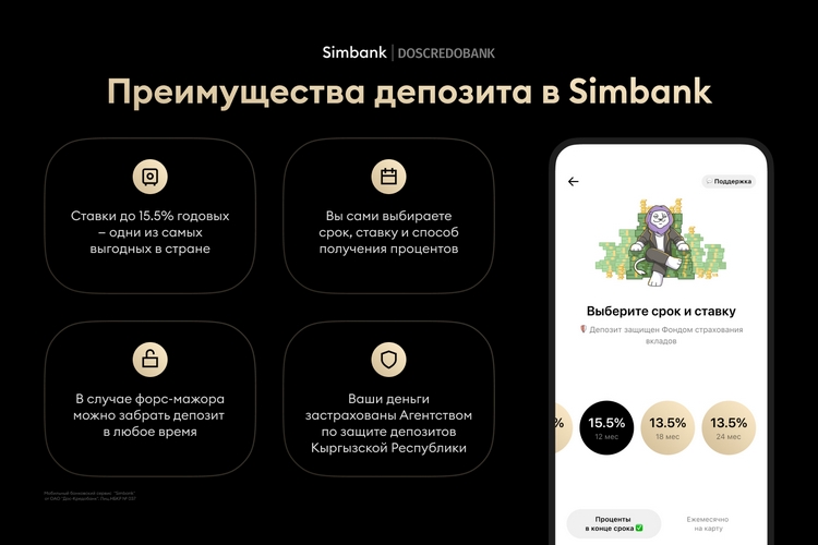 - Высокая доходность. Ставки до 15,5 процента годовых — одно из самых привлекательных предложений на рынке Кыргызстана.