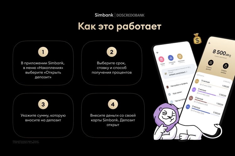 «Мы хотим, чтобы банковские продукты были не только выгодными, но и максимально понятными. Депозит в Simbank — это возможность получать доход без лишних сложностей, а управление всегда под рукой в приложении», — отмечают в Simbank.