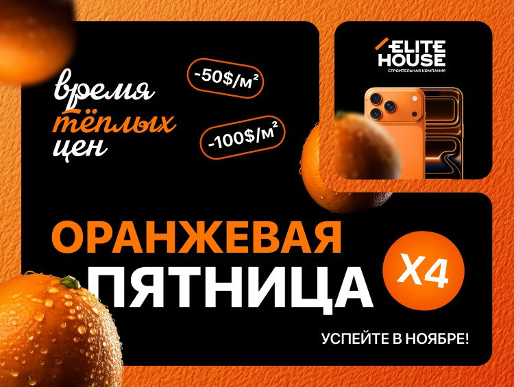 «Оранжевая пятница x4» проходит в течение всего ноября — каждую пятницу месяца. Подробности и условия участия можно уточнить в отделах продаж Elite House и на официальных страницах компании в социальных сетях.