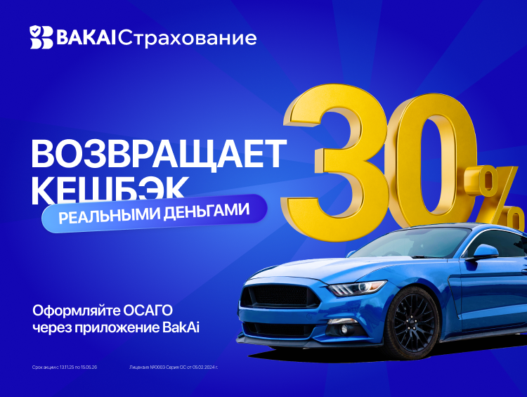 «BAKAI Страхование» объявляет о возобновлении крутой акции — кешбэк 30 процентов реальными деньгами при покупке полиса ОСАГО через приложение BakAi!