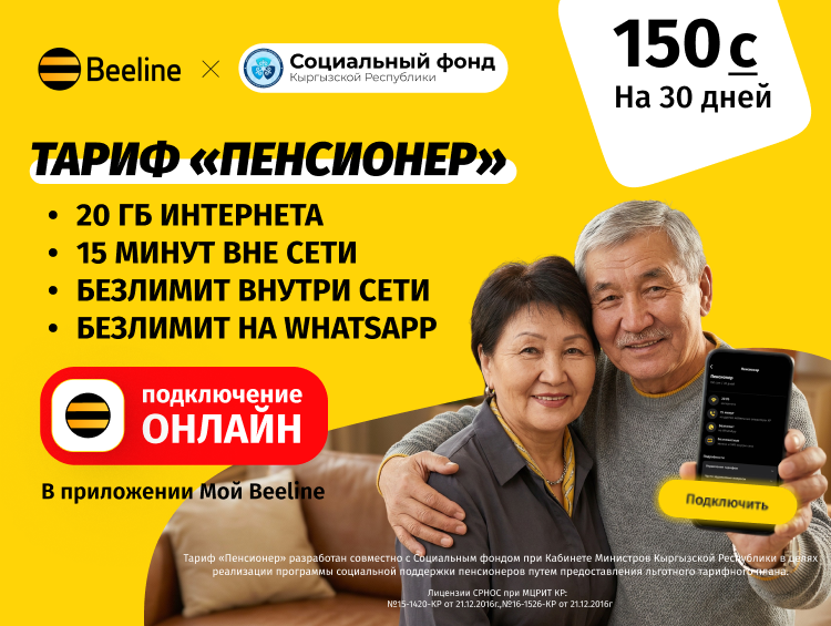 Недавно государственный мобильный оператор Beeline запустил тариф «Пенсионер», разработанный совместно с Социальным фондом при кабинете министров Кыргызской Республики. Главное в этом продукте — забота, продуманная до мелочей: от выгодных условий до удобных способов подключения.
