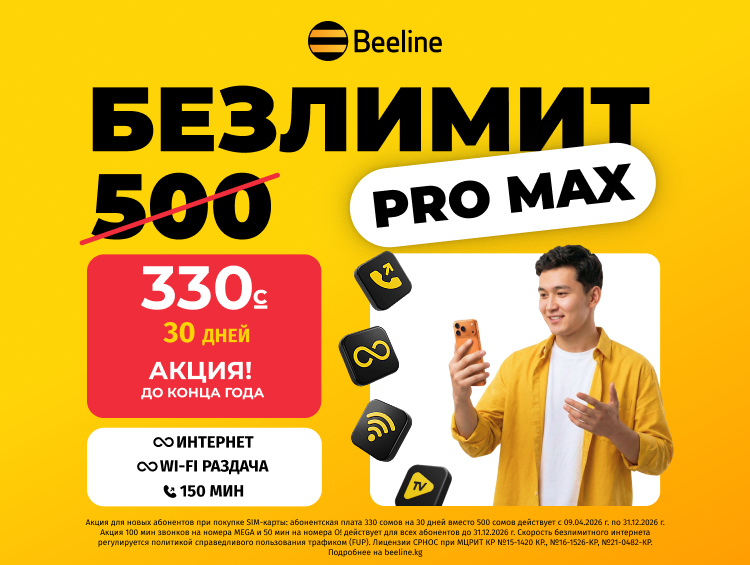 Хорошего интернета много не бывает, поэтому Beeline сделал безлимитный трафик еще доступнее. Теперь при покупке новой SIM-карты тариф «Безлимит 500 Pro Max» можно подключить со скидкой — всего за 330 сомов на 30 дней.