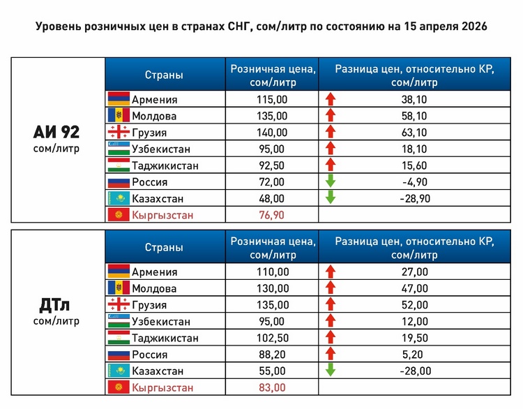 Доставка нефтепродуктов из России в Кыргызстан стоит денег. К тому же здесь их облагают налогами и акцизами. В итоге складывается себестоимость одного литра топлива: более 80 сомов за бензин Аи-92 и более 102 сомов за дизель. Доля сборов в конечной цене для потребителей составляет 15-16 процентов.
