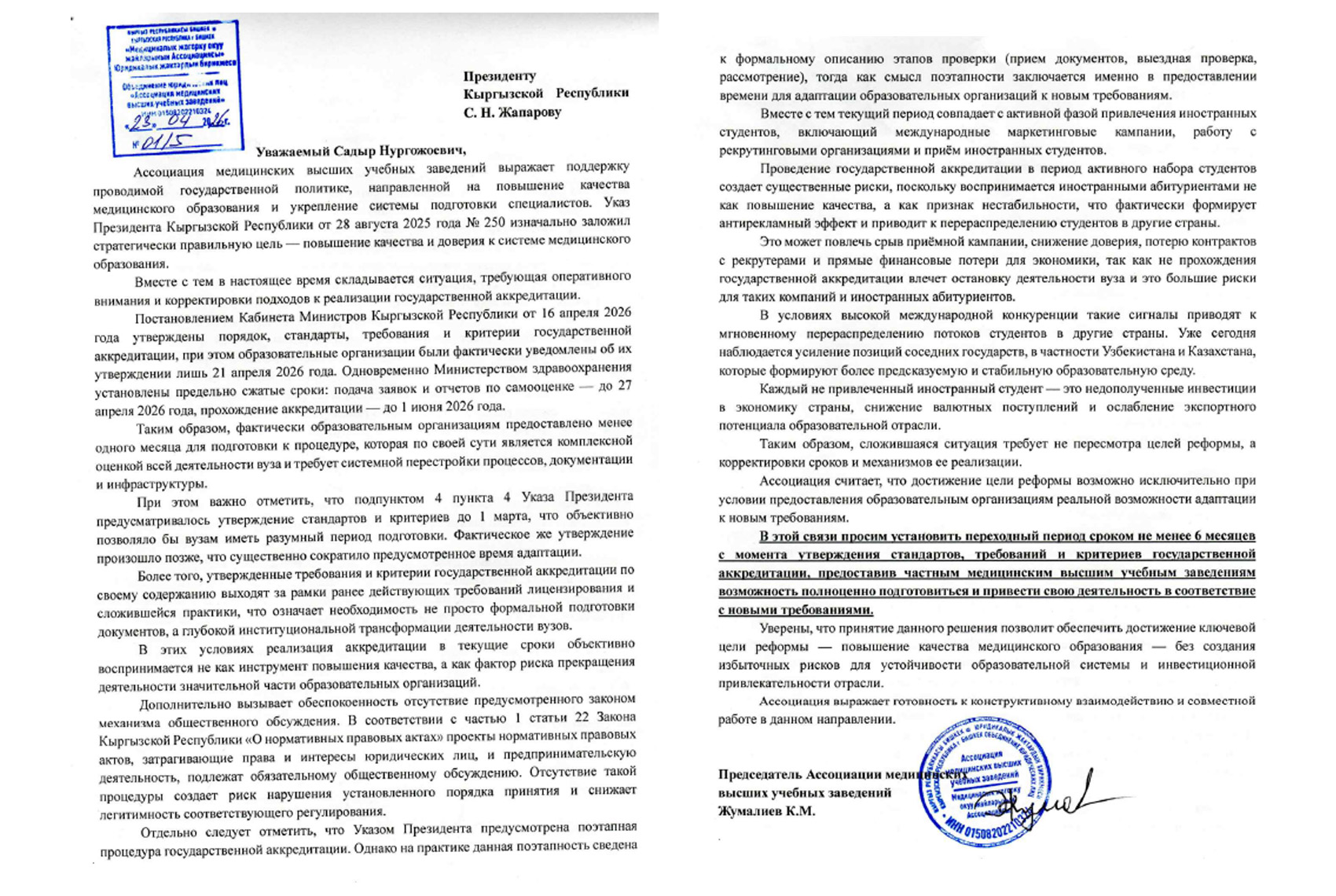Авторы обращения просят Садыра Жапарова установить переходный период сроком не менее шести месяцев с момента утверждения стандартов, требований и критериев государственной аккредитации, предоставив частным медицинским высшим учебным заведениям возможность полноценно подготовиться и привести свою деятельность в соответствие с новыми требованиями.