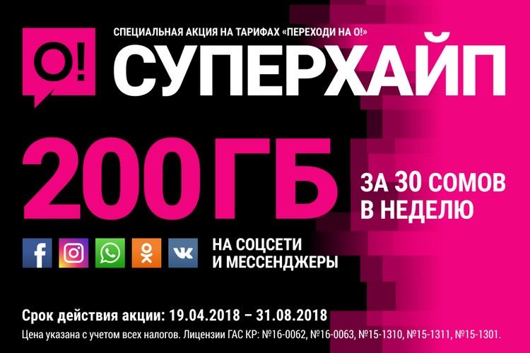 Специально для вас Мобильный оператор О! запустил специальную акцию «СУПЕРХАЙП» на самых популярных тарифах: «Переходи на О!+», «Переходи на О! Light+» и «Переходи на О! Light + TV Базовый». Дополнительно к основному еженедельному пакету интернет-трафика в рамках тарифа вы получите не 20, не 40 и даже не 100 гигабайт Интернета, а 200(!), да-да, вы не ослышались, целых 200 ГИГАБАЙТ Интернета на любимые социальные сети и мессенджеры по акции «СУПЕРХАЙП» всего за 30 сомов с учетом всех налогов!