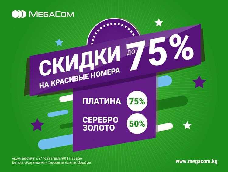 Во всех центрах продаж и обслуживания и фирменных салонах мобильного оператора, украшенных по случаю праздника, кыргызстанцам будут предоставляться приятные скидки на приобретение номеров платных категорий — 27-29 апреля индивидуальным абонентам, 27 и 28 апреля корпоративным абонентам: