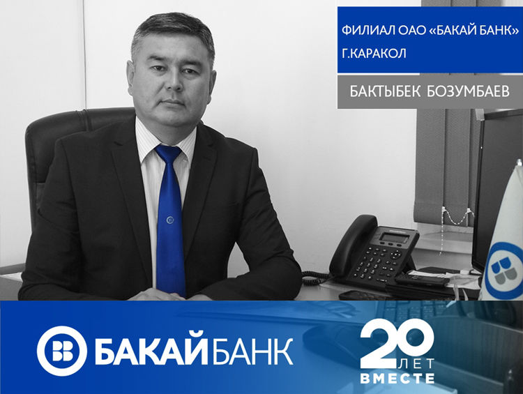 ОАО «Бакай Банк» успешно развивается на территории Кыргызстана на протяжении двадцати лет. Филиалы по всей республике предоставляют множество видов услуг как частным потребителям, так и корпоративным клиентам. Индивидуальные посетители имеют возможность пользоваться кредитами и депозитами, платежными пластиковыми карточками, переводами и коммунальными платежами, сейфовой ячейкой. Все эти и другие услуги предоставляются в Каракольском филиале «Бакай Банка». О его работе рассказал управляющий Бактыбек Бозумбаев.