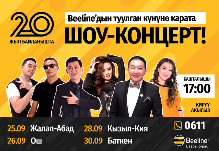С 25 по 30 сентября Beeline проведет концерты на юге Кыргызстана с участием исполнителей кыргызской эстрады. Торжественные мероприятия пройдут в Оше, Джалал-Абаде, Баткене и Кызыл-Кие в рамках кампании «Спасибо», приуроченной к 20-летию компании.