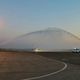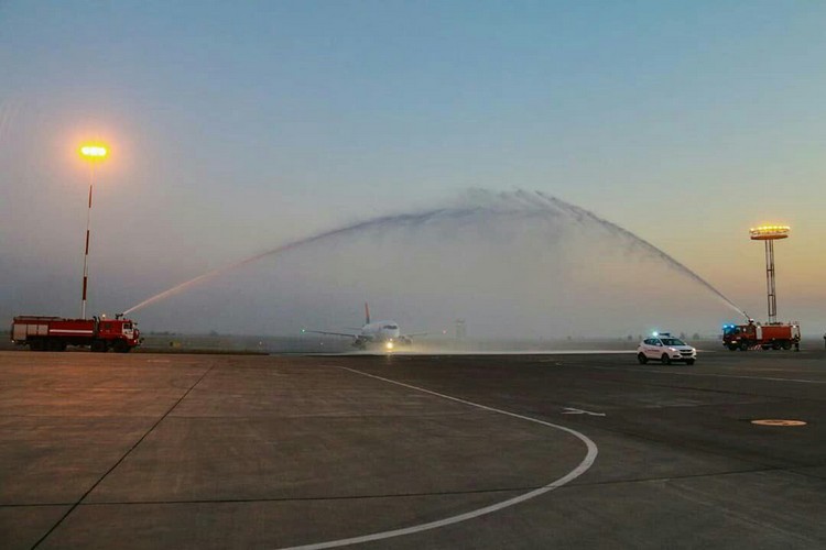 В Международном аэропорту «Манас» по традиции встречи первых рейсов воздушное судно приветствовали «аркой триумфа» — водяной аркой.