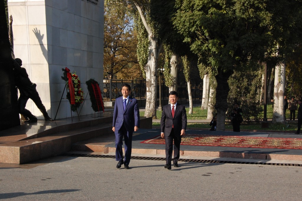 Фото ИА «24.kg». Премьер-министры Кыргызстана Темир Сариев и Японии Синдзо Абэ после возложения цветов к памятнику Героям апрельской революции в Бишкеке.