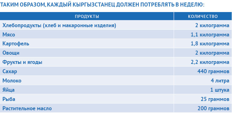 Правительство Кыргызстана утвердило нормативы питания кыргызстанцев еще в 2009 году. Согласно документу каждый житель страны ежемесячно должен употреблять 9 наименований продуктов питания.