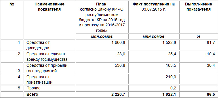 За шесть месяцев 2015 года поступление средств от управления госимуществом в доходную часть республиканского бюджета составило 1 миллиард 992,1 миллиона сомов. Об этом сообщает пресс-служба Фонда по управлению государственным имуществом (ФУГИ).