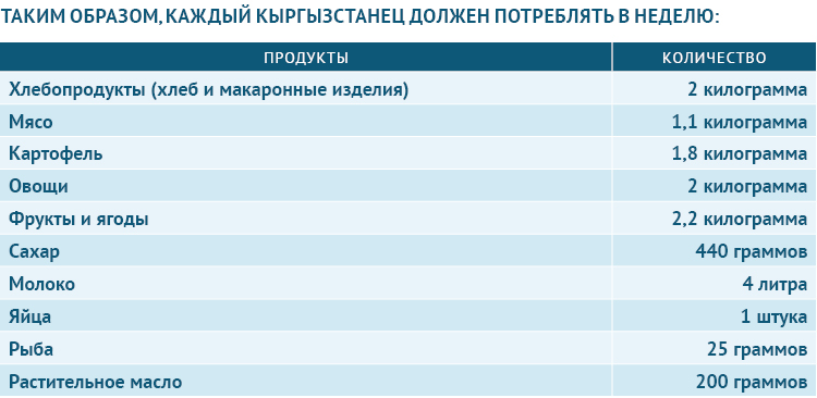 Правительство утвердило нормативы питания кыргызстанцев еще в 2009 году. Согласно документу, каждый житель страны ежемесячно должен употреблять девять наименований продуктов питания.