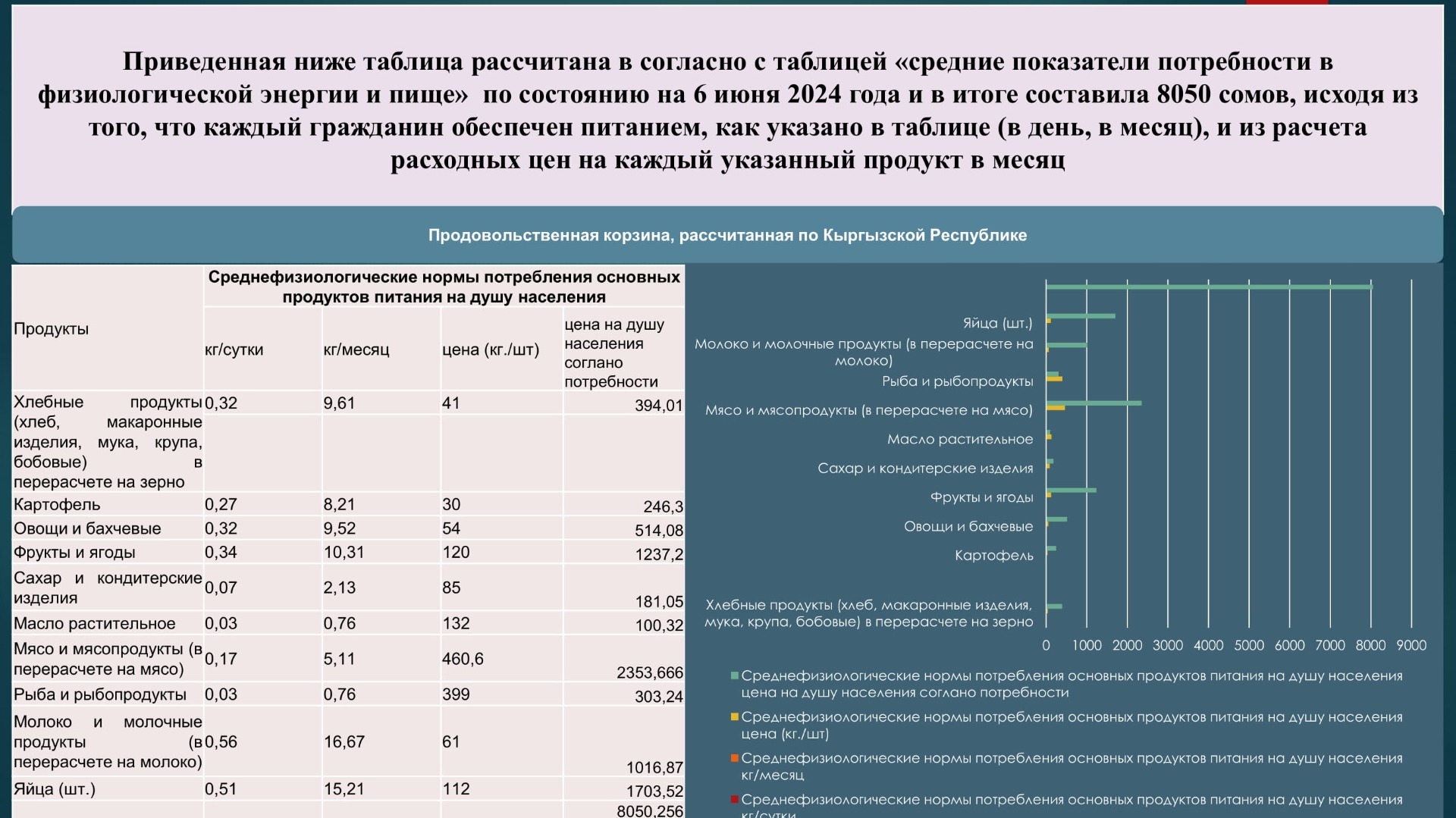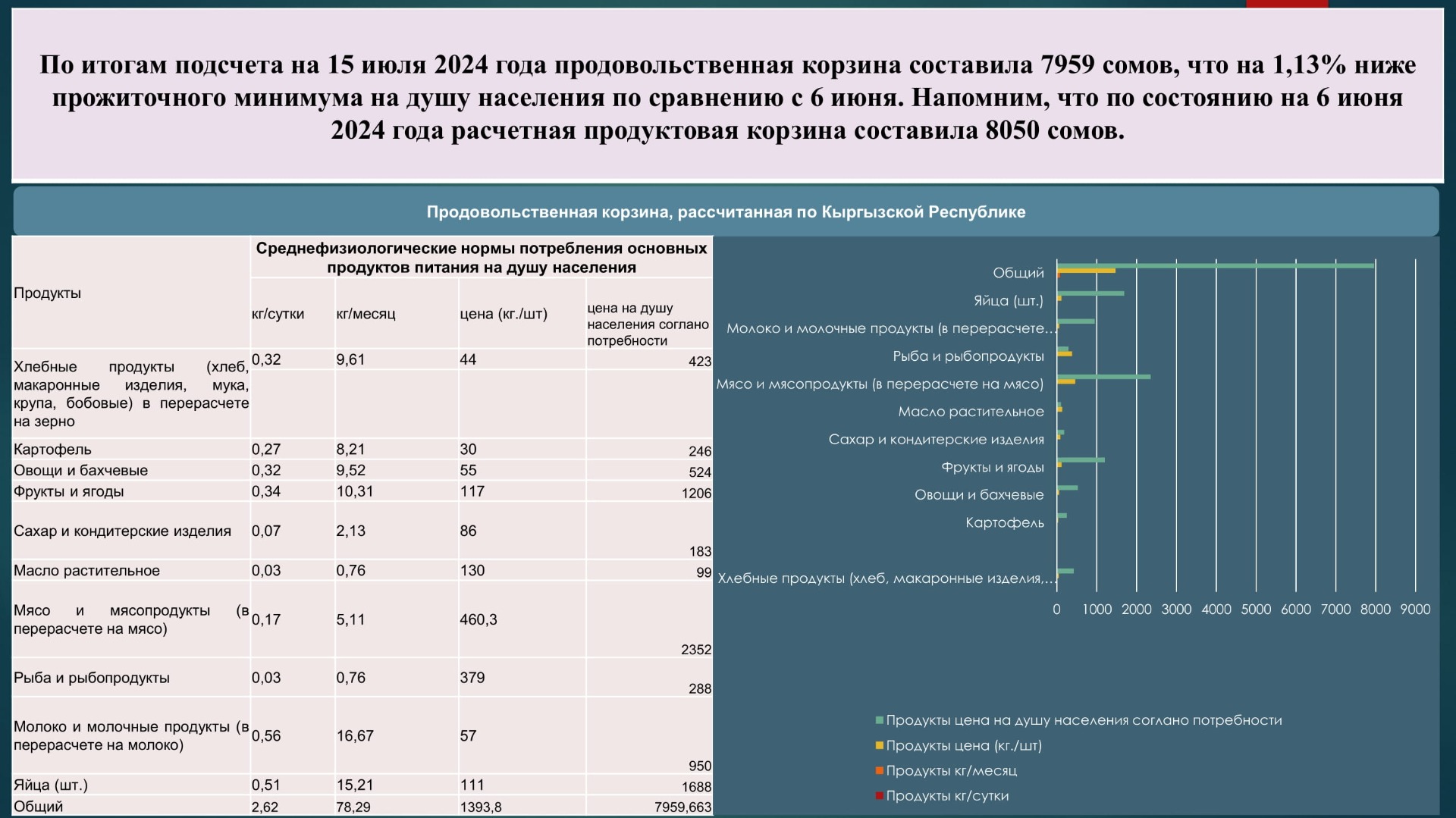 Прожиточный минимум в республике, рассчитанный с учетом стоимости продовольственной корзины, составил в июне 2024 года 8 тысяч 50 сомов на душу населения. В июле показатель снизился до 7 тысяч 959 сомов, что свидетельствует о снижении цен на 1,13 процента по сравнению с июнем.