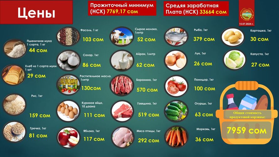 В июле отмечено снижение цен на несколько продуктов по сравнению с июнем. Рис подешевел на 27 сомов, фасоль — на 34 сома, картофель — на 7 сомов. Стоимость помидоров уменьшилась на 11 сомов. Однако цена на муку 1-го сорта выросла на 2 сома, а на лук-порей — на 11 сомов.