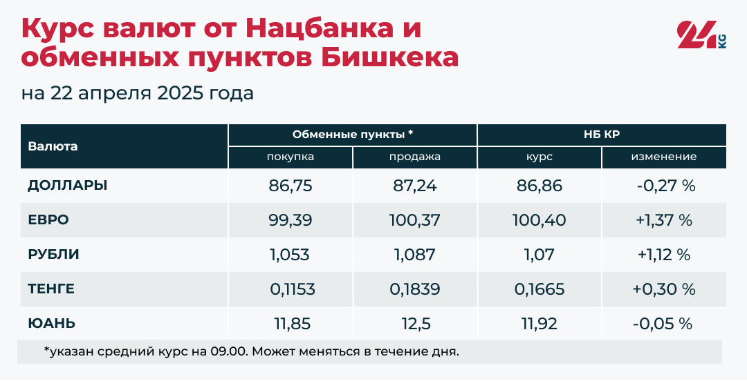 Официальный курс Нацбанка — 86,8678 сома (снижение — 0,27 процента). Средний курс в обменных пунктах Бишкека за последние два часа: покупка — 86,74 сома, продажа — 87,22 сома.