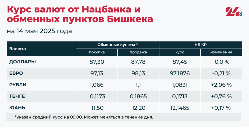 • Официальный курс Нацбанка — 12,1465 сома (рост — 0,17 процента).